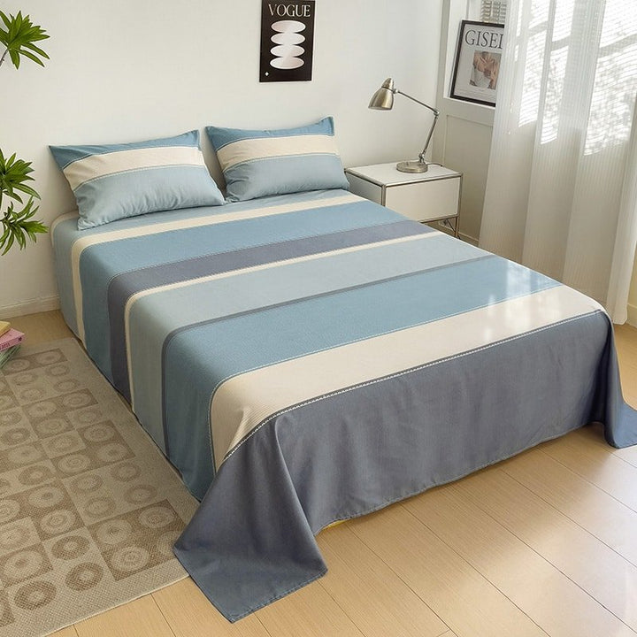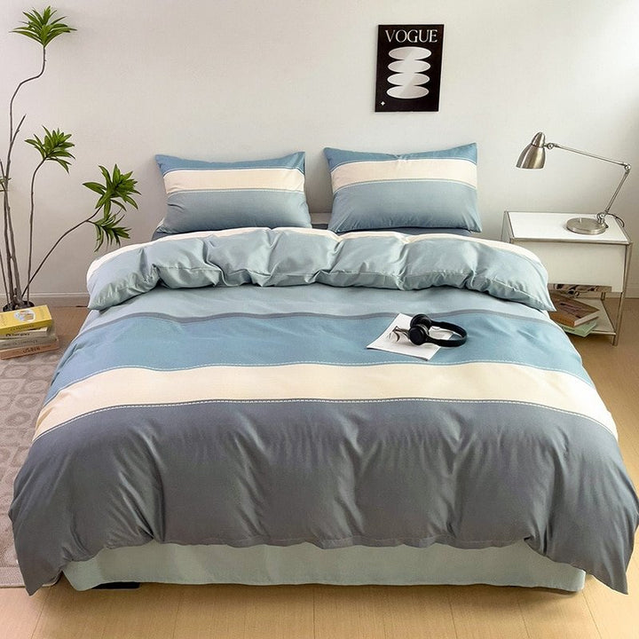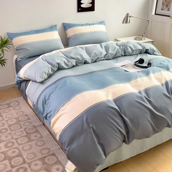 KIT ACOLCHADO + JUEGO DE SABANA LINEAS AZULES + (2) ALMOHADAS