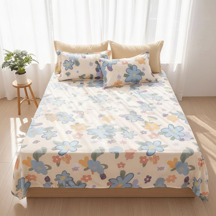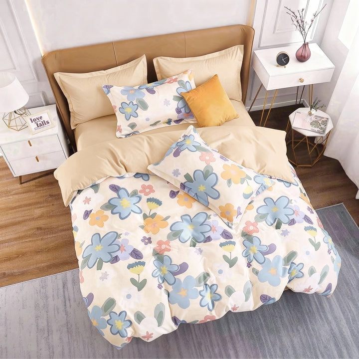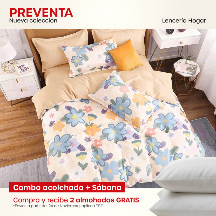 KIT ACOLCHADO + JUEGO DE SABANA PRIMAVERA COLORES + (2) ALMOHADAS SILICONADAS
