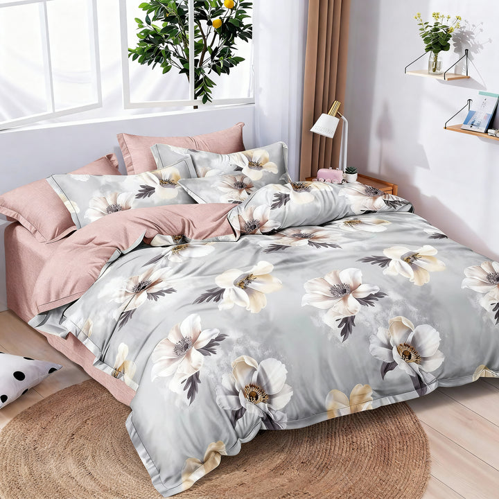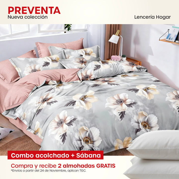 KIT ACOLCHADO + JUEGO DE SABANA PRIMAVERA GRIS + (2) ALMOHADAS SILICONADAS