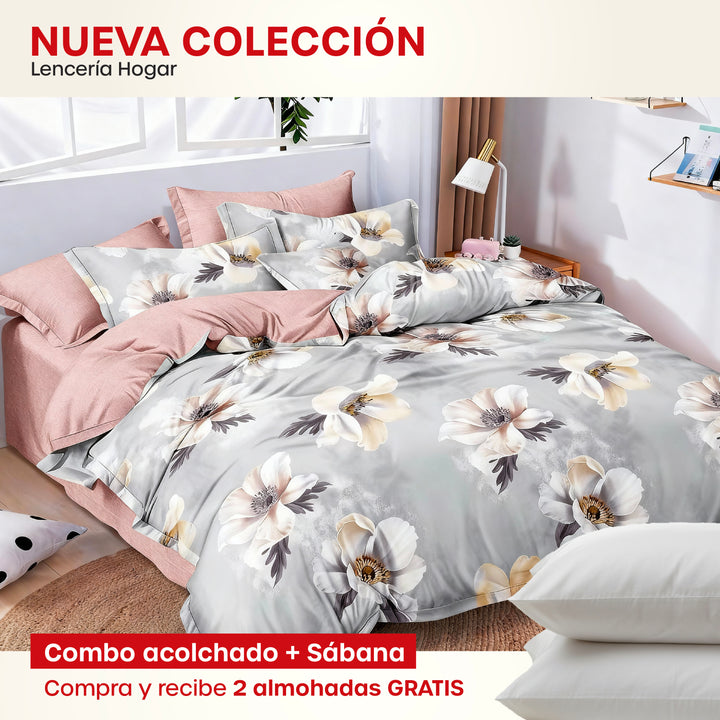 KIT ACOLCHADO + JUEGO DE SABANA PRIMAVERA GRIS + (2) ALMOHADAS SILICONADAS