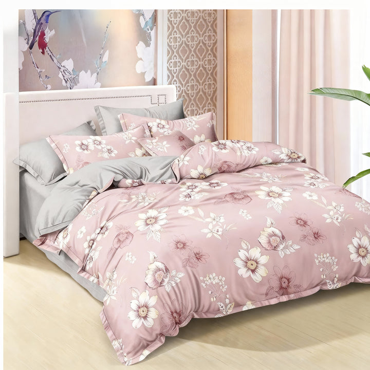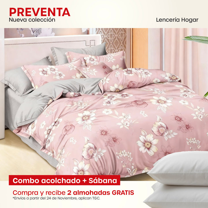 KIT ACOLCHADO + JUEGO DE SABANA PRIMAVERA ROSA + (2) ALMOHADAS SILICONADAS