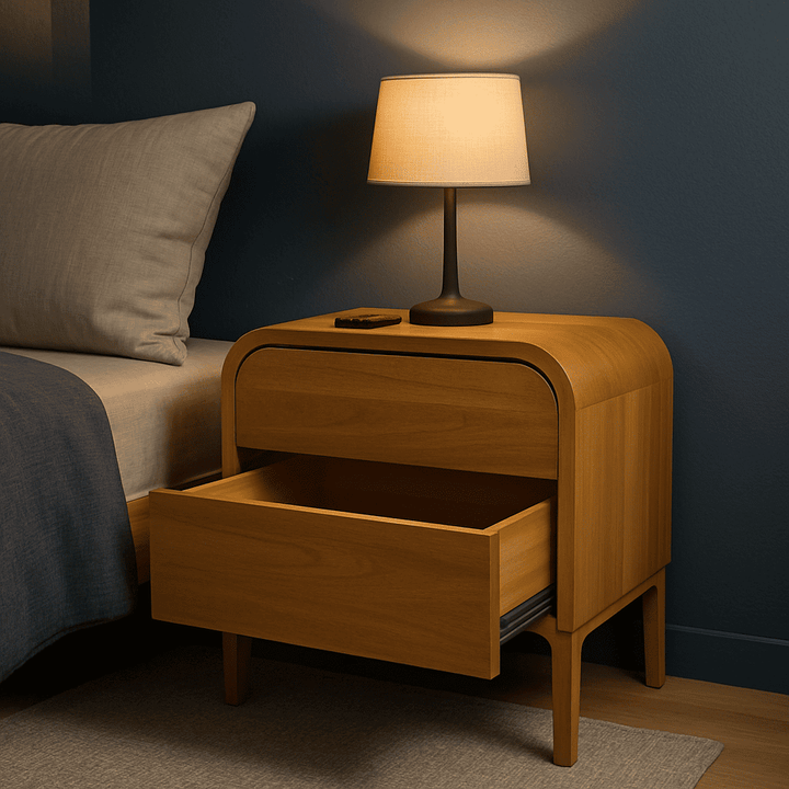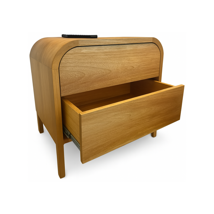 Nochero en flor morado diseño curvo y sistema de apertura push.