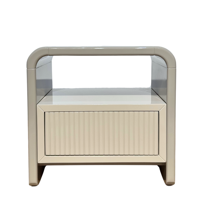 Nochero en cedro diseño curvo y sistema de apertura push.