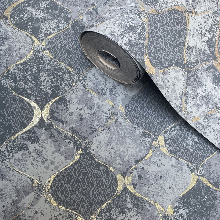 Papel de colgadura con un acabado rustico, en tono blanco y beige, con pequeños visos dorados.