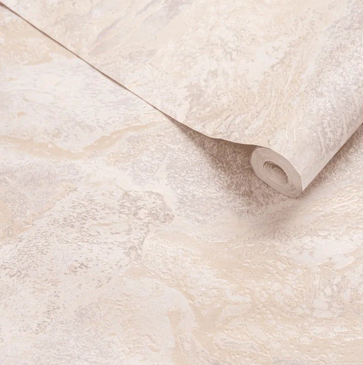 Papel de colgadura con un acabado rustico, en tono blanco y beige, con pequeños visos dorados.