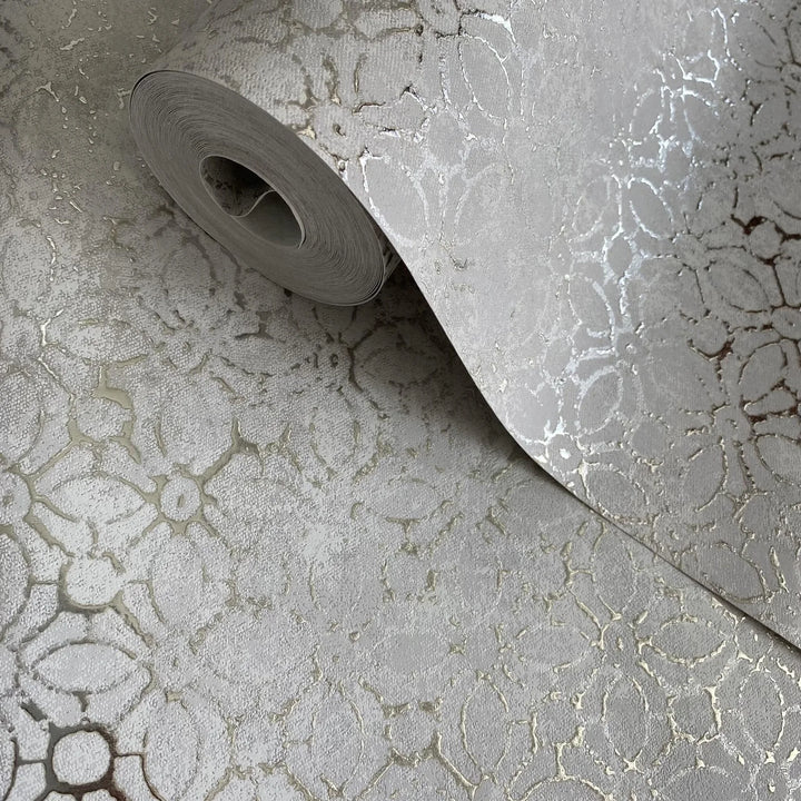 Papel de colgadura con un acabado rustico, en tono blanco y beige, con pequeños visos dorados.
